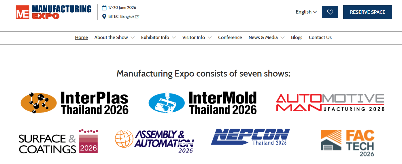 Manufacturing Expo每年一屆在泰國曼谷舉辦,至今已成功舉辦了 32 屆。 2025 年該展有來自東南亞各國的 88,445人次客商到會參觀洽談,有來自 30 多個國家和地區的 2000 家參展商參展,展出面積約 6 萬平方米,是泰國影響力最大的工業制造類展會,其展出規模在東南亞地區也是首屈一指。Manufacturing Expo是東盟地區制造業及配套產業最全面的盛會,將滿足每條生產線提升生產力、降低成本和增加利潤的需求。該展會由7個專業展會組成,涵蓋: